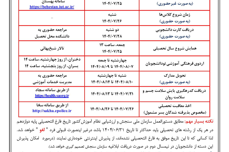 قابل توجه پذيرفتهشدگان آزمون سراسری سال 1404 دانشگاه صنعتي اصفهان
