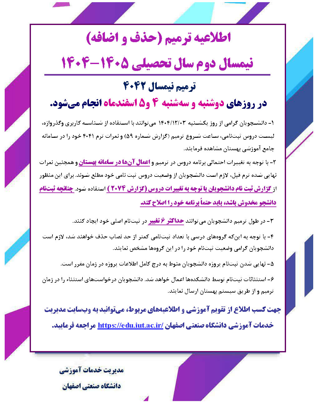 اطلاعیه ترمیم (حذف و اضافه) نیمسال دوم سال تحصیلی 405-404 پیوست اندازه اطلاعیه ترمیم (حذف و اضافه) نیمسال دوم سال تحصیلی 405-404 173 کیلوبایت